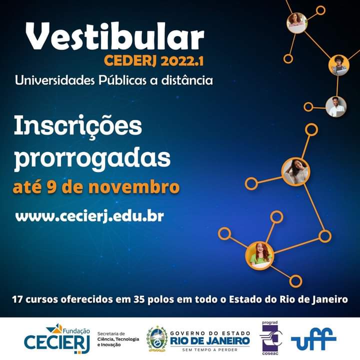 Os interessados em participar do Vestibular Cederj 2022.1 têm mais uma chance para realizar a inscrição. O prazo foi prorrogado até o dia 9 de novembro e o pagamento da taxa de inscrição, no valor de 85,00 (oitenta e cinco reais), deverá ser realizado, impreterivelmente, até o dia 10 de novembro. O concurso visa o preenchimento de 7594 vagas em dezessete cursos de graduação a distância oferecidos de forma gratuita por sete instituições de ensino superior no âmbito do Consórcio Cederj, coordenado pela Fundação Cecierj, vinculada da Secretaria de Estado de Ciência, Tecnologia e Inovação. Todas as informações estão disponíveis na página do concurso em https://www.cecierj.edu.br/consorcio-cederj/vestibular/2022-1/ .