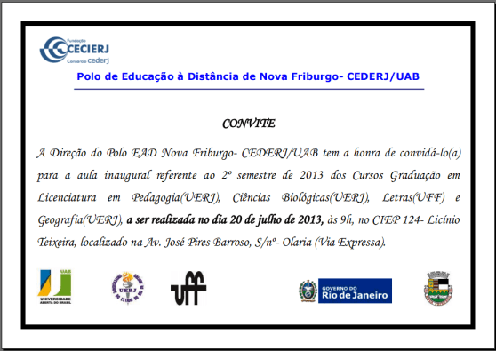 A direção do Polo pede que a partir do dia 17, após terem feito a inscrição, compareçam ao Polo para retirarem o material didático antes do dia 20, evitando a demora na secretaria. Assim vocês poderão participar da Aula inaugural.