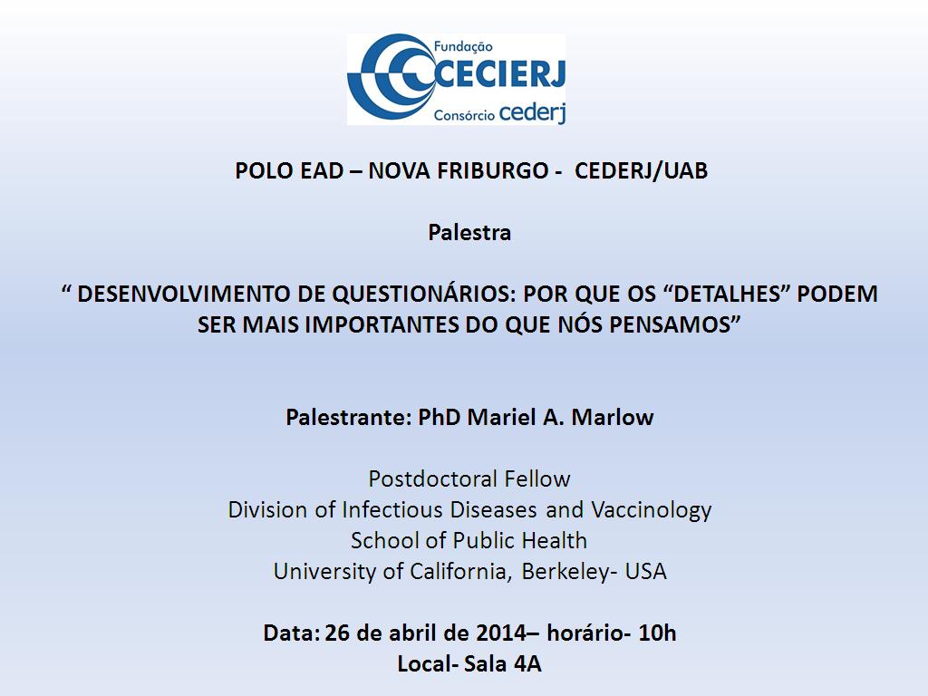 No sábado 26 de abril, a PhD Mariel A. Marlow, da Universidade da Califórnia, dará uma palestra no Polo EAD de Nova Friburgo sobre o desenvolvimento de questionários.