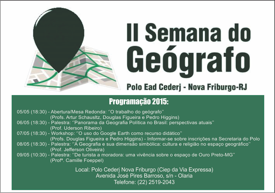 II Semana do Geógrafo Publicado porpolofriburgo1 de maio de 2015Publicado emCultural, Eventos, Geografia Relacionado