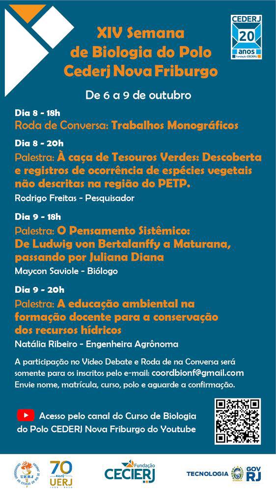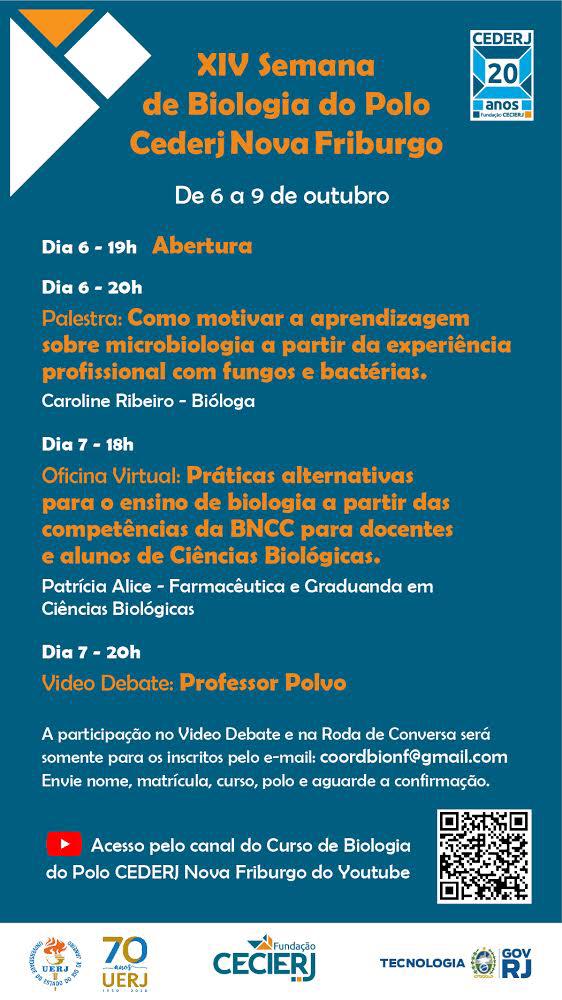 XIV SEMANA DE BIOLOGIA DO POLO CEDERJ/UAB NOVA FRIBURGO Publicado porpolofriburgo5 de outubro de 2020Publicado emAtividades Acadêmicas, Biologia, CEDERJ, Eventos, Palestra, Polo EAD de Nova Friburgo Relacionado