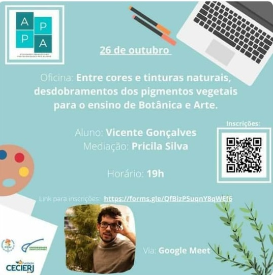 A oficina de hoje será “Entre cores e tinturas naturais, desdobramentos dos pigmentos vegetais para o ensino de Botânica e Arte” do aluno Vicente Gonçalves, aluno do polo CEDERJ – Magé, que desenvolve seu TCC com esse mesmo tema.