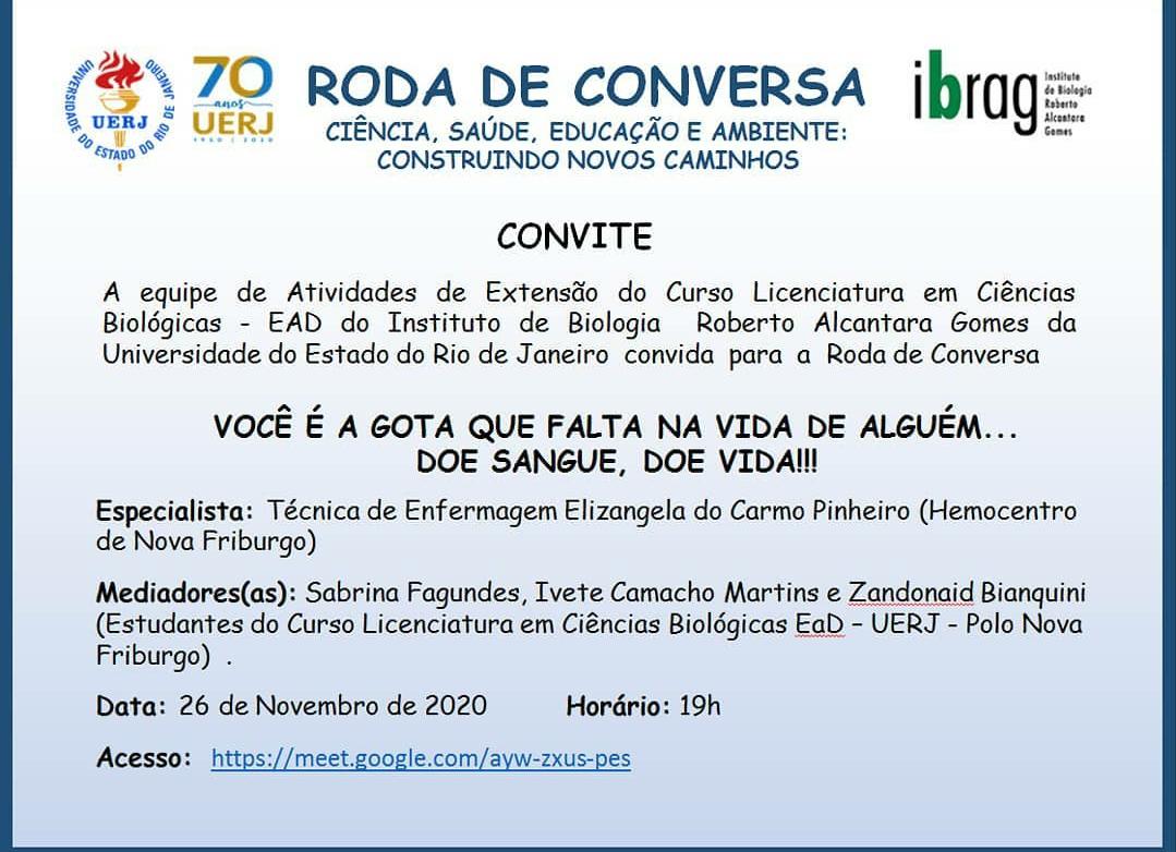 RODA DE CONVERSA – Atividades de Extensão UERJ Publicado porpolofriburgo24 de novembro de 2020Publicado emAtividades Acadêmicas, Biologia, CEDERJ, Convite, Extensão, UERJ Relacionado