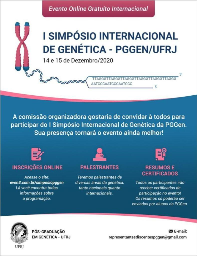 I Simpósio Internacional de Genética – PGGEN/UFRJ Publicado porpolofriburgo3 de dezembro de 2020Publicado emAtividades Acadêmicas, Biologia, Convite, Eventos Inscrições até dia 11/12 no link: https://www.even3.com.br/simposiopggen/ O evento será 100% gratuito e on-line. Relacionado