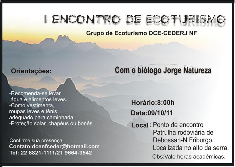 E no domingo dia 09/10, acontecerá o I Encontro de Ecoturismo. Veja informações na imagem a seguir.